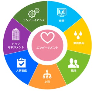 JMARのエンゲージメントサーベイは、従業員エンゲージメントを中心に置き、7つの要素で構成されています。