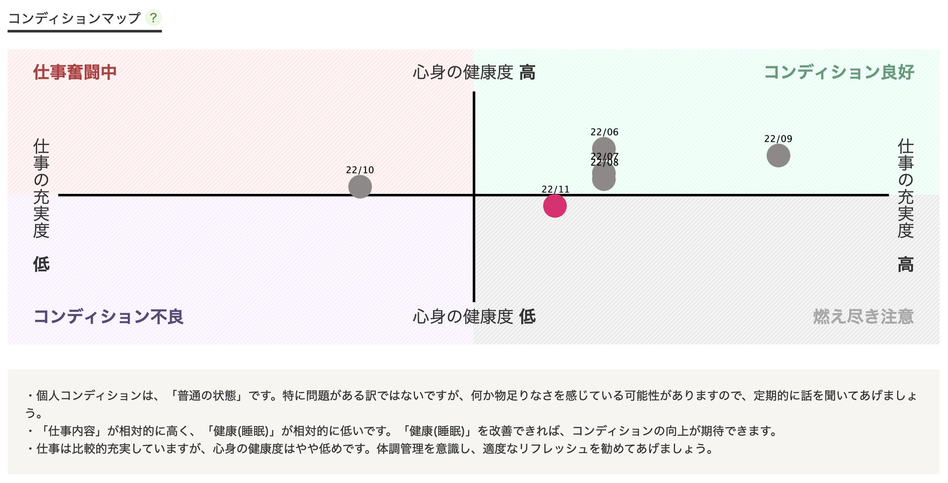 マネージャーは、部下の現在のコンディションが「コンディション良好」「燃え尽き注意」「仕事奮闘中」「コンディション不良」のどの状態か把握し、直近6ヶ月間の変化を確認できます。また、退職リスクがどの程度あるかも把握できるので、有望社員の離職予防に向けたフォローをタイムリーに行うことができるようになります。