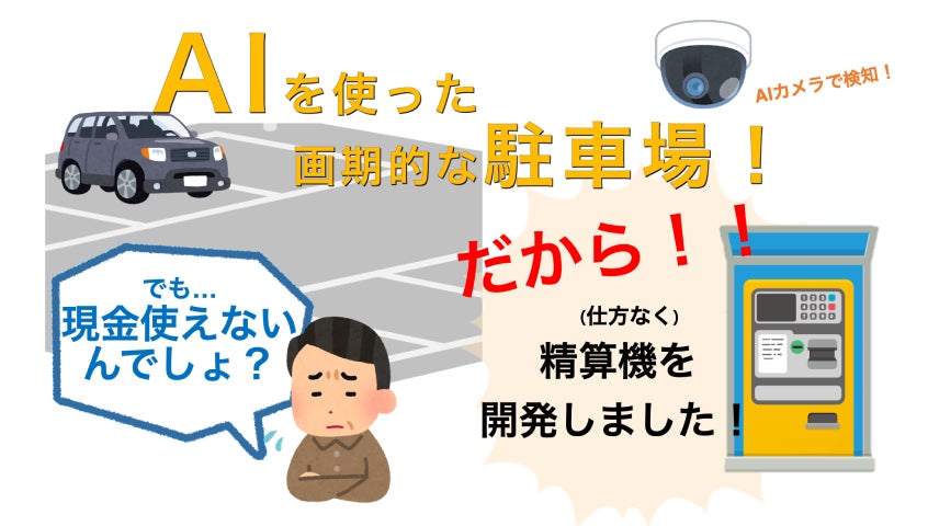 AI搭載カメラとスマホがあれば駐車場が運営できるシステム「電脳パーク」が、お客様の声にお応えして現金決済に対応するため、初めて精算機設備を開発いたしました。