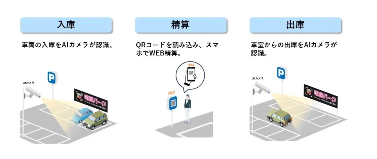 ・独自開発のAI技術を活用したAIカメラとクラウドサーバーが駐車する車を認識し、入出庫時間、利用料金、ナンバープレート情報等を管理。従来パーキング運営に必要であったフラップ板、ループコイル、ゲート、発券機等の機材を必要とせず、AIカメラのみで運営します。ユーザーはスマホ決済のみで駐車場利用することができます。