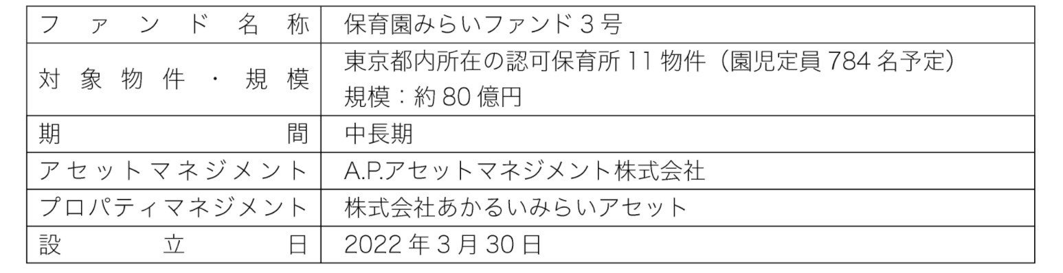 本ファンドはA.P.アセットマネジメント株式会社(本社:東京都千代田区、代表取締役社長:島田克美)並びにさくらさくプラスの持分法適用関連会社である株式会社あかるいみらいアセット(本社:東京都千代田区、代表取締役:磯昌幸)が、2021年3月に組成した「保育園みらいファンド2号」に続く保育園特化型の不動産ファンド3号として組成されています。また本ファンドは都市部を中心とした待機児童問題という社会的な課題解決にご賛同いただきました株式会社かんぽ生命保険(東京都千代田区、取締役兼代表執行役社長 千田哲也)芙蓉総合リース株式会社(本社:東京都千代田区、代表取締役社長: 辻田泰徳)、四国電力株式会社(本社:香川県高松市、取締役社長:長井啓介)からの出資で実施しています。