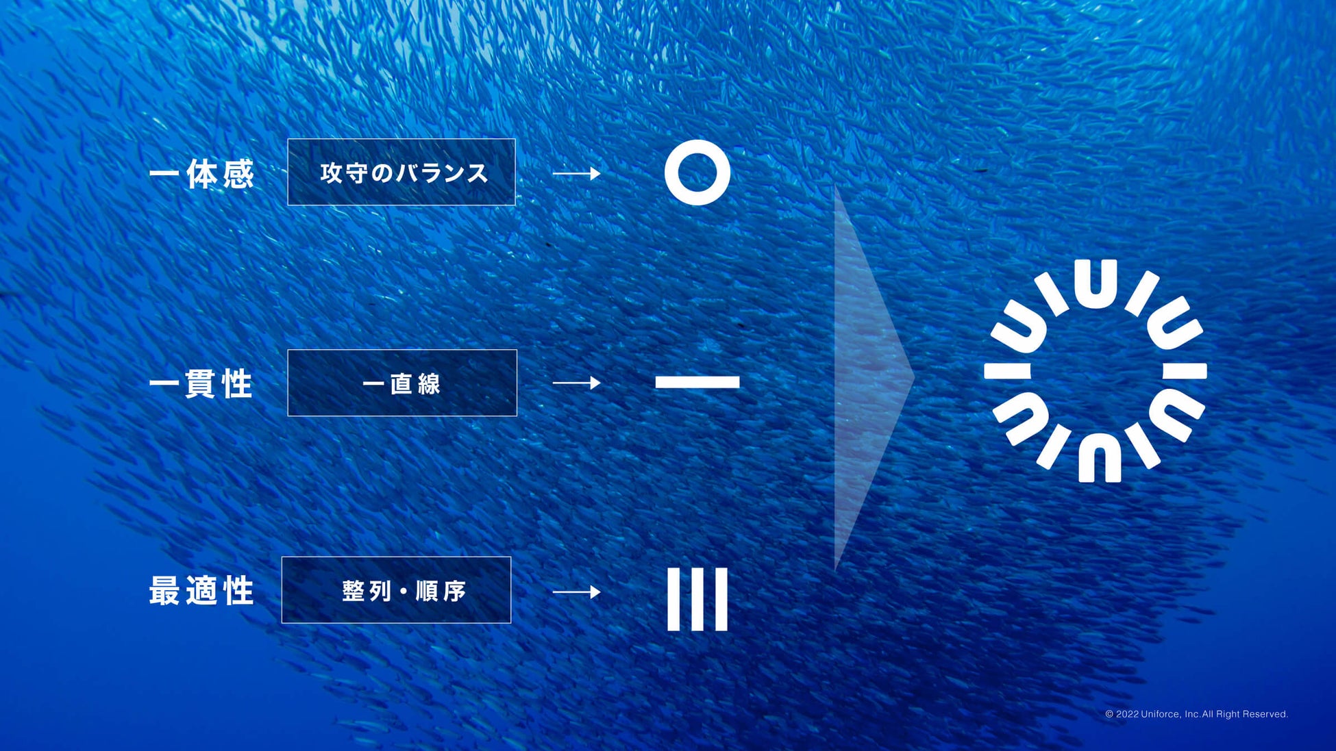 チームで会社のミッションを達成していく様子を表現するために、3つの言語が「魚群」魚が群れで闘っている様子と、「攻守のバランス」「一貫性」「最適性」が同時に感じられるようなビジュアル設計を目指しました。