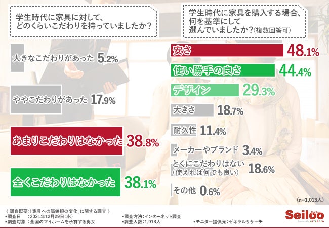 そこで、「学生時代に家具を購入する場合、何を基準にして選んでいましたか?(複数回答可)」と質問したところ、『安さ(48.1%)』と回答した方が最も多く、次いで『使い勝手の良さ(44.4%)』『デザイン(29.3%)』と続きました。