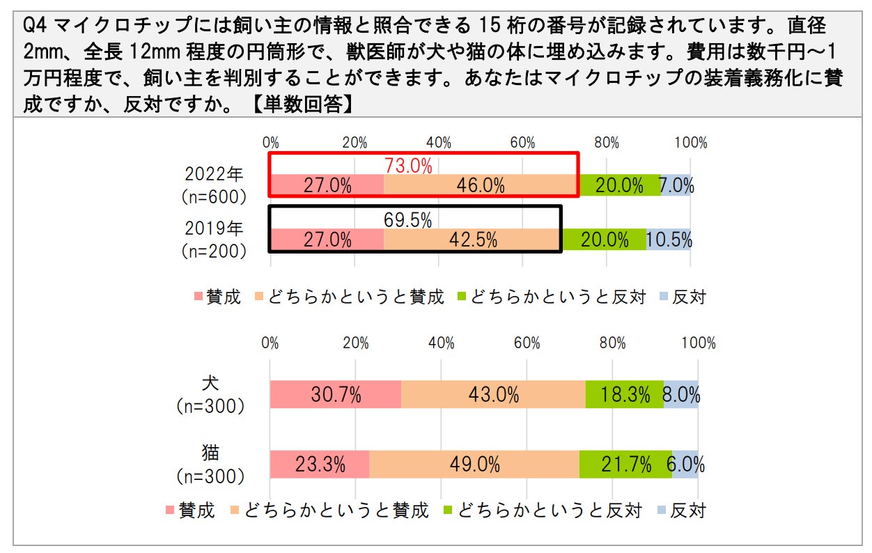 マイクロチップ装着義務化への賛成は73.0%(2019年と比べて3.5ポイント増加)