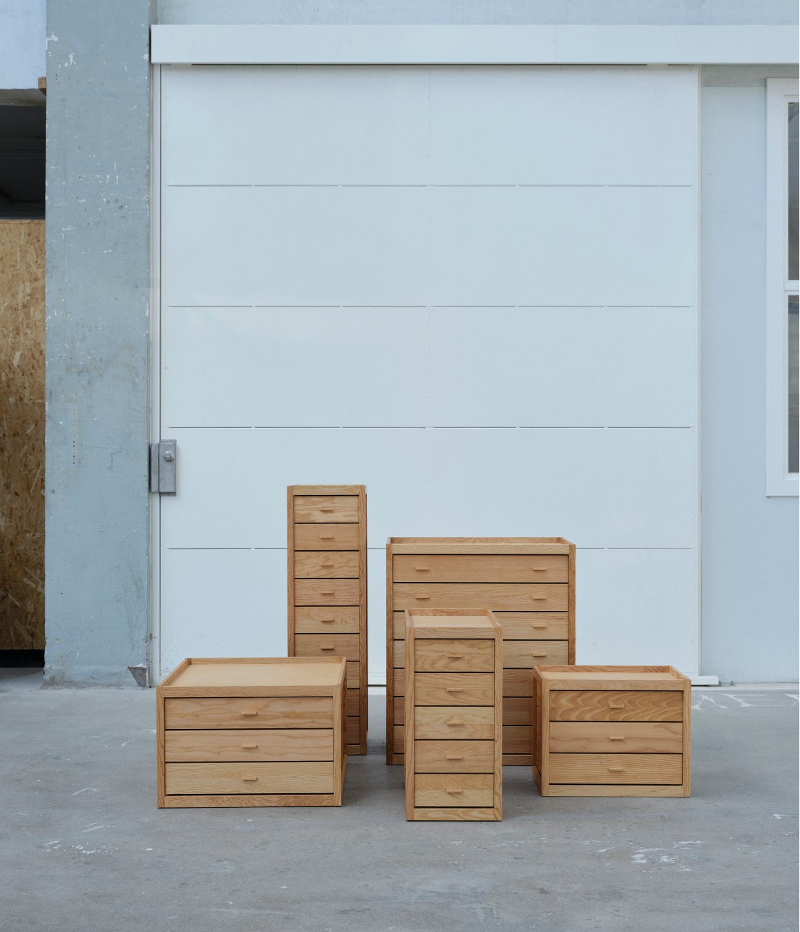 本展の素材は、2011年にカール・ハンセン&サン社によって事業が継承され、デンマーク最古の家具工房と言われたRud. Rasmussen(ルド・ラスムッセン)に残されていたオレゴンパイン材が使用されています。板材は引き出しに加工され、木箱をモチーフにしたフレームの内側に保護され積み重ねてられています。共通の構造に異なるフォルムのキャビネットで構成される遊び心に加え、個々に独自のスタイルと機能を備えたコレクションです。