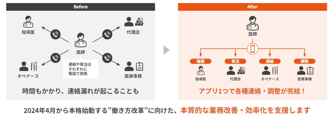 2. 若手執刀医が上級医・オペ室・代理店に対して、それぞれ電話で連絡・調整を行っている業務が、本アプリを導入することで、Webで全て完結することができます。(インプラントNavi)