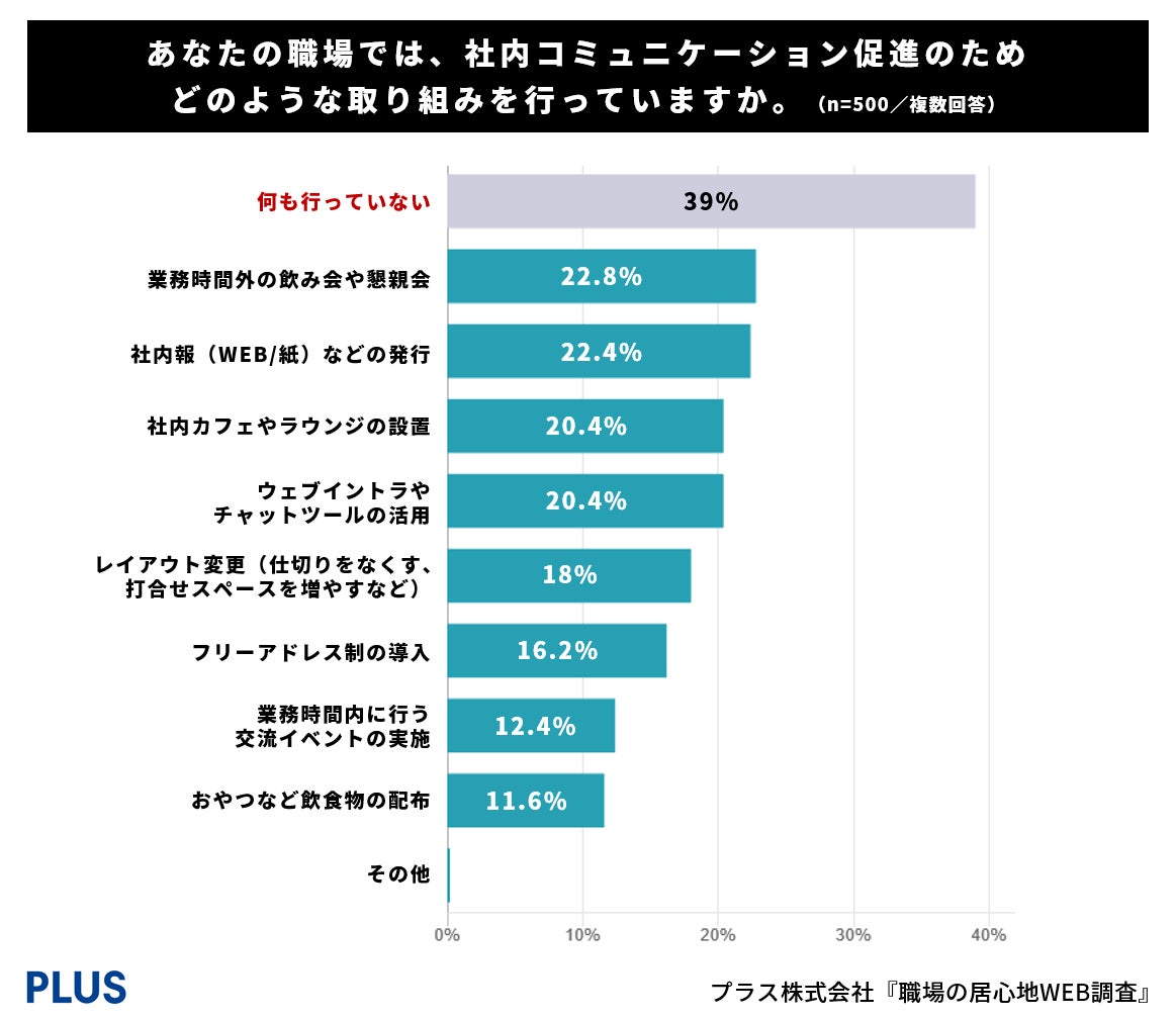 結果は「何も行っていない」が39%で最も高く、次いで「業務時間外の飲み会や懇親会」、「社内報(WEB/紙)などの発行」と続きました。