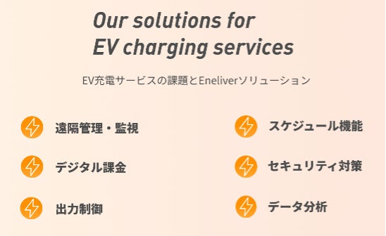 Eneliverは、これからも、既存の顧客基盤や多数の施設を保有する企業様に対して、充電システムの提供・開発・運用、マルチベンダー充電器の調達、設置工事、保守、補助金支援、カスタマーサポートなど、各企業のニーズに合わせた最適なソリューションを提供して参ります。