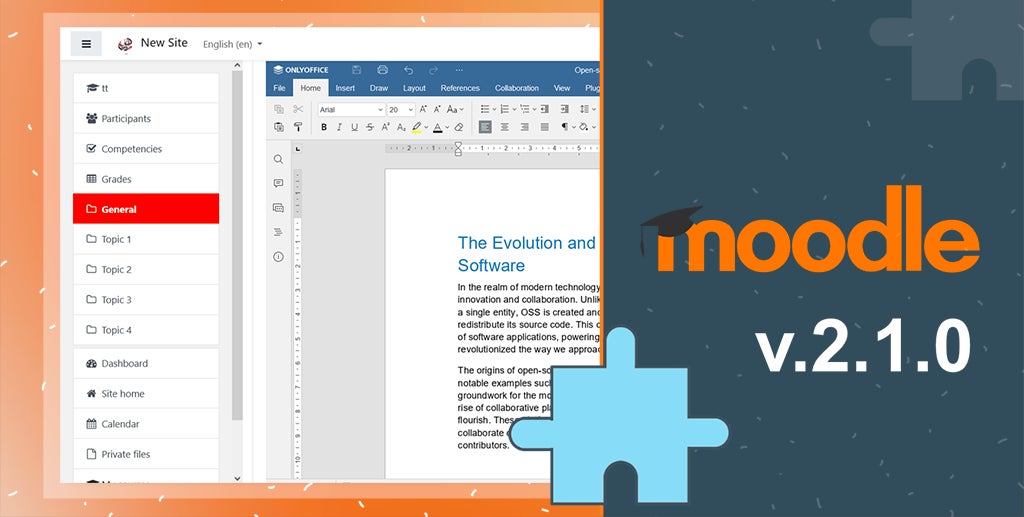 Ascensio Systems Pte. Ltd(シンガポール)は、Moodleプラットフォーム用のONLYOFFICEの課題提出プラグインの新バージョン2.1.0をリリースしました。このアップデートにより、教師と学生は課題の作成および提出時に文書、スプレッドシート、プレゼンテーションを利用できるようになりました。