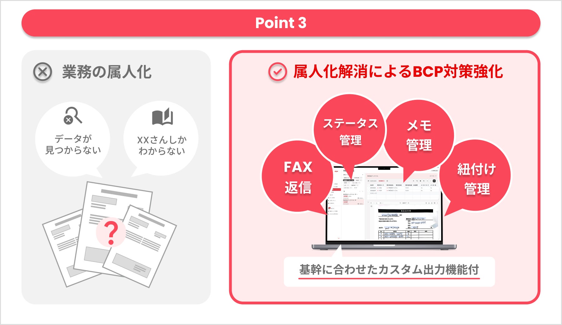 FAX返信、ステータスやメモの管理、FAX間の紐付け機能、基幹に合わせたカスタム出力、検索など紙からクラウドに切り替えることによって属人化を解消することができます。