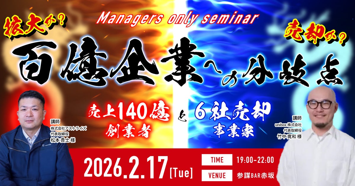 全国400社超の中小企業経営支援を行う株式会社経営参謀(本社:東京都新宿区、代表取締役:新谷 健司)が運営する経営者コミュニティ「参謀」は、2026年2月17日(火)19時より、同社が運営する経営者コミュニティ「参謀」主催の勉強会『拡大か?売却か?100億企業への分岐点』を開催いたします。 本イベントでは、一代で売上140億円を達成した株式会社アストライズ代表・松本 貴士氏と、計6回の事業売却(イグジット)実績を持つunibox株式会社代表・竹中 寛和氏をゲストに招き、経営者が直面する成長戦略のジレンマについて、実体験に基づく「本音の対論」を行います。