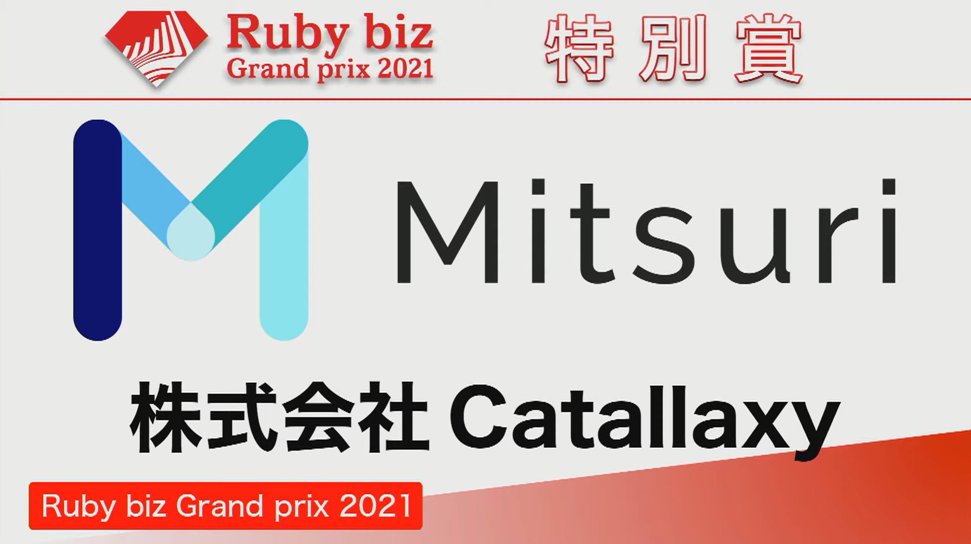 株式会社Catallaxy(以下、当社)が運営する特注金属加工品の商取引プラットフォーム「Mitsuri」が、プログラム言語Rubyの特徴を活かして、継続的に発展が期待できるビジネスを表彰する「Ruby biz Grand prix 2021」にて、特別賞を受賞いたしました。