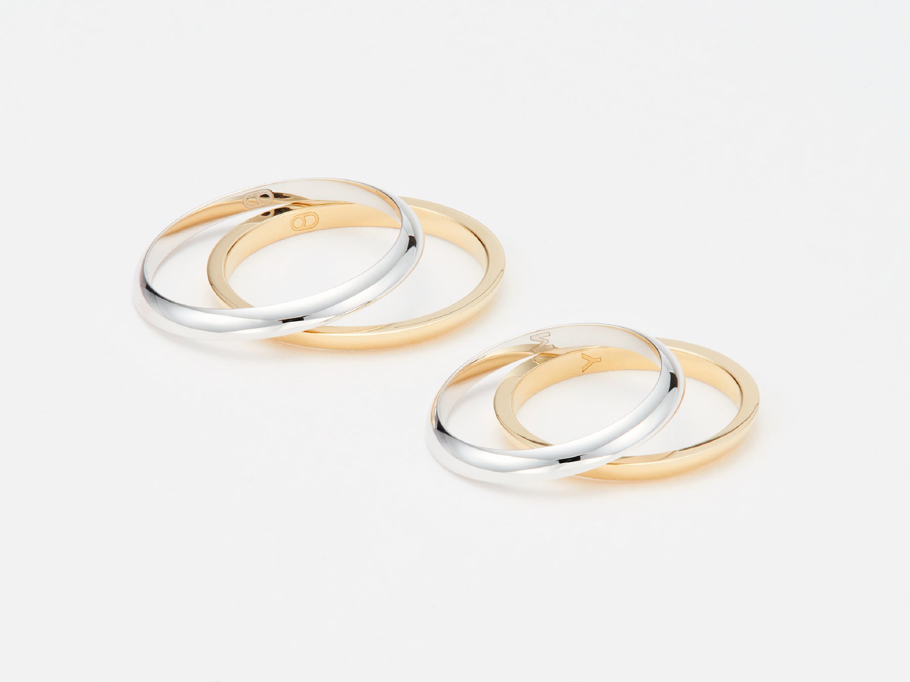 プラチナゴールドは、異なる素材の指輪を重ね合わせることで完成 する CONNECT です。貴金属と総称される 2つの素材は、その美しさと希少性の高さ、耐腐食性と加工のしやすさによって人類史上もっとも愛され続けています。甲乙つけがたい価値と性質を持ちながら、 それぞれの魅力を放つプラチナとゴールド。