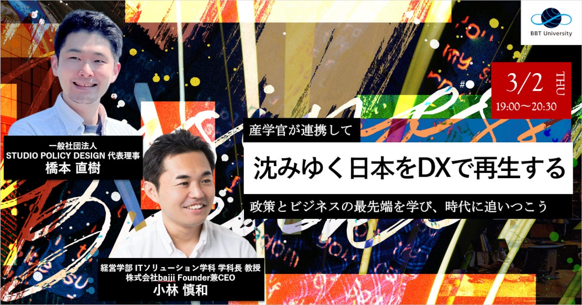 あらゆる年齢層に対し生涯にわたるリカレント教育を提供する株式会社ビジネス・ブレークスルー(所在地:東京都千代田区、代表取締役:柴田巌、以下BBT)が運営するビジネス・ブレークスルー大学(学長:大前研一、以下BBT大学)は、2023年3月2日に公開ビジネスセミナー『産学官が連携して、沈みゆく日本をDXで再生する~政策とビジネスの最先端を学び、時代に追いつこう~』を開催する運びとなりました。