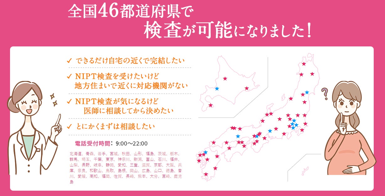 医療法人社団福美会ヒロクリニックNIPTのNIPT(新型出生前診断)検査は46都道府県(65箇所)で受検ができるようになりました。