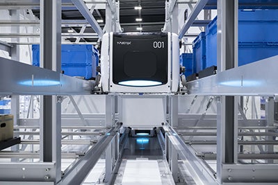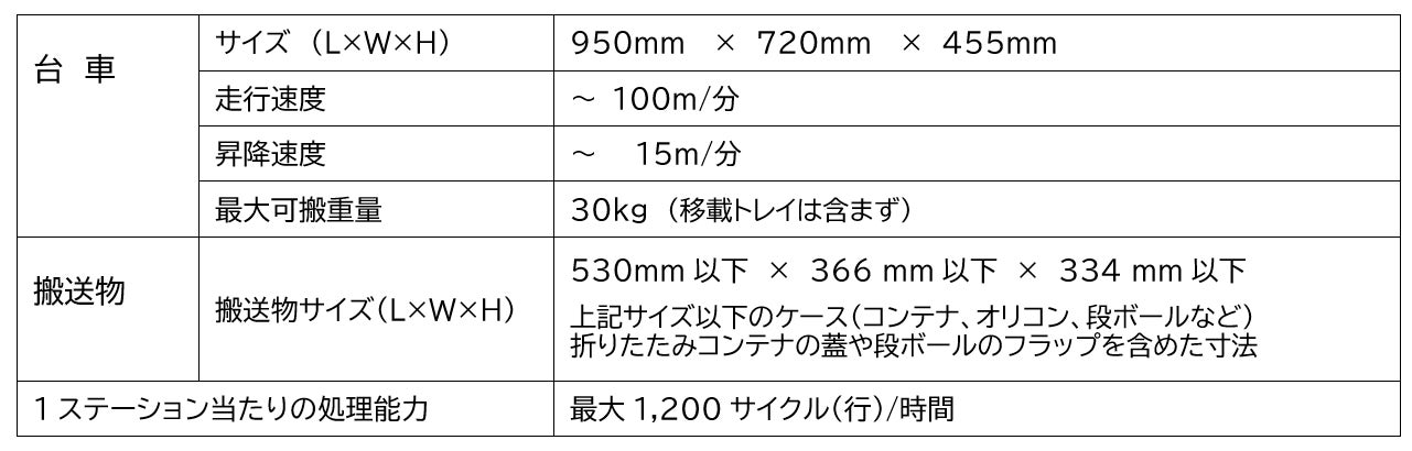 搬送台車が商品を作業者の手元まで運んでくる「Goods to Person」方式を採用しており、作業者の負担軽減や作業ミス低減による省人化を実現。さらに、天井空間を有効活用すると同時に、搬送台車と保管エリア、走行エリア、ピッキングエリアをモジュール化することにより、お客さまの事業拡大や物量変化に応じて増設・拡張が可能なシステムとなっています。