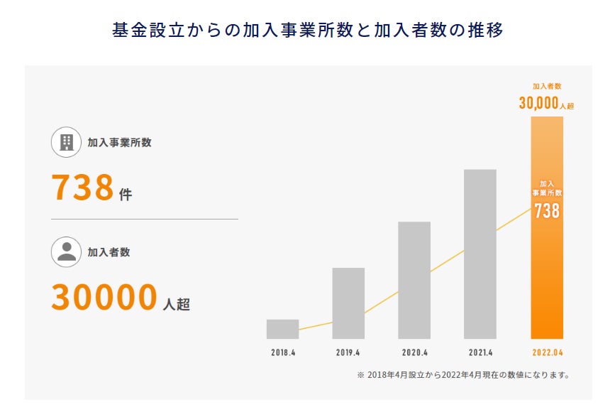 基金設立後わずか4年間で、加入事業所数738、加入者数が約18倍の30,085人(2022年4月末現在)となりました。急成長をとげている理由として、導入法人にとって安心安全な仕組みや充実したサポート体制を提供していることと、加入者が元本保証で安心して積立ができ、かつスマホひとつで簡単に手続きができることが挙げられます。「はぐくみ基金」を導入した事業主の従業員の平均加入率は65%を超え、非常に高い加入率となっています。