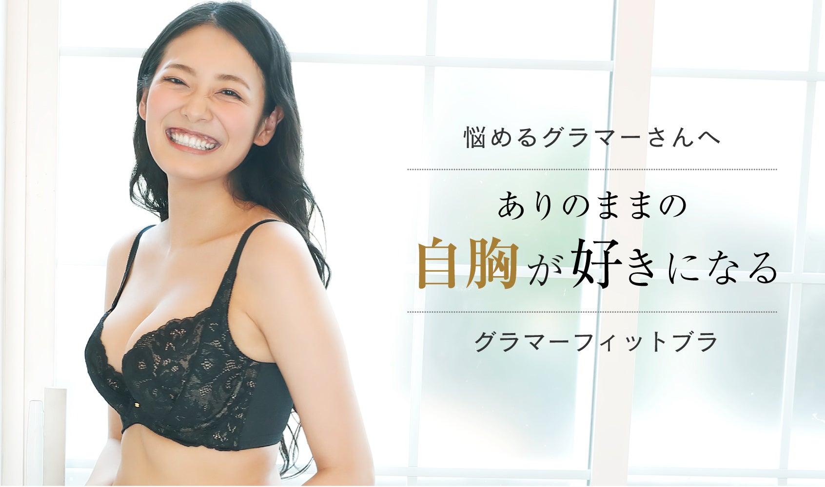 やせ型や小胸と同様、「バストが大きくて太って見える」「肩が凝る」「身体にぴったりとフィットするニット系の洋服に自信がもてない」など、グラマーサイズならではの悩みも多くあります。そんなバストボリュームの悩みを解決するブラが「グラマーフィットブラ」です。大きな胸を潰しすぎずバストを高く持ち上げ、脇の広がりを押さえながらバストに自然な丸みを作ります。グラモアブラにはなかったアンダーサイズ85やH-Iカップとサイズも新展開。脇肉がはみ出たり、バストトップの低さからくる「ふけ見え」がありません。自胸で作る美しいバストシルエットは、女性をよりポジティブな気持ちにしてくれます。