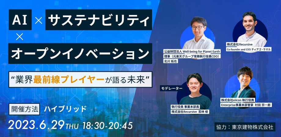 AI/データ戦略を専門とし、公益社団法人Well-being for Planet Earth共同創業者兼理事である北川 拓也氏とAI企業のグローバルリーダーであるDeepMind(ディープマインド)社を経て、AIソリューションを提供するリカーシブを設立したティアゴ・ラマルが、AIがどのように持続可能な社会を作る貢献するのか、ビジネスに役立つのかなど世界の事例を挙げて解説。またオープンイノベーションのプロフェッショナルであるエイコンの村田 宗一郎氏が、AIテクノロジーを事業に取り入れることによって、付加価値向上のための新たな事業の可能性をわかりやすく説明します。