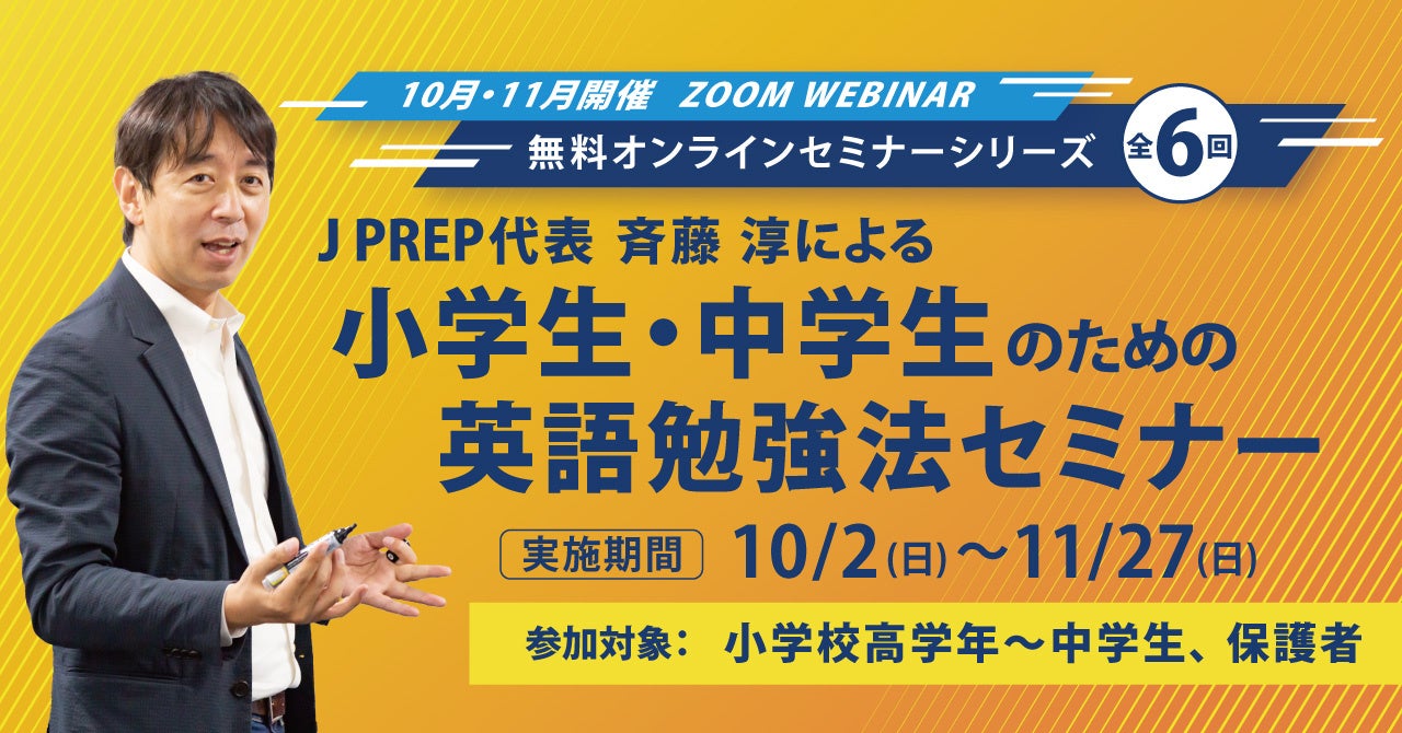 ⼩学⽣・中学⽣・⾼校⽣対象の英語塾 J PREPを運営する株式会社J Institute(本社:東京都⽬⿊区、代表取締役:⻫藤淳)は、オンラインの「小学生・中学生のための英語勉強法セミナー」を6回シリーズ(無料)で開催します。