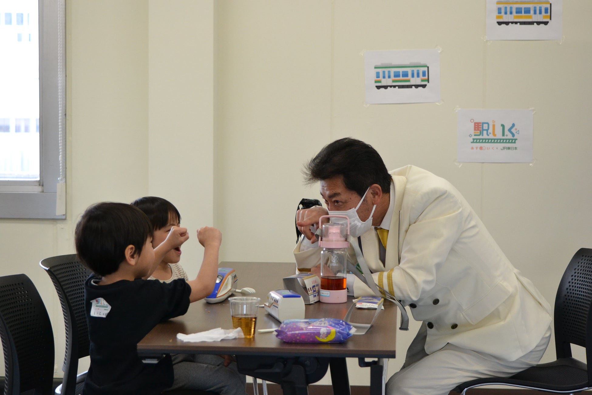 ①駅に設けた保育スペースで駅⻑さんにご挨拶!