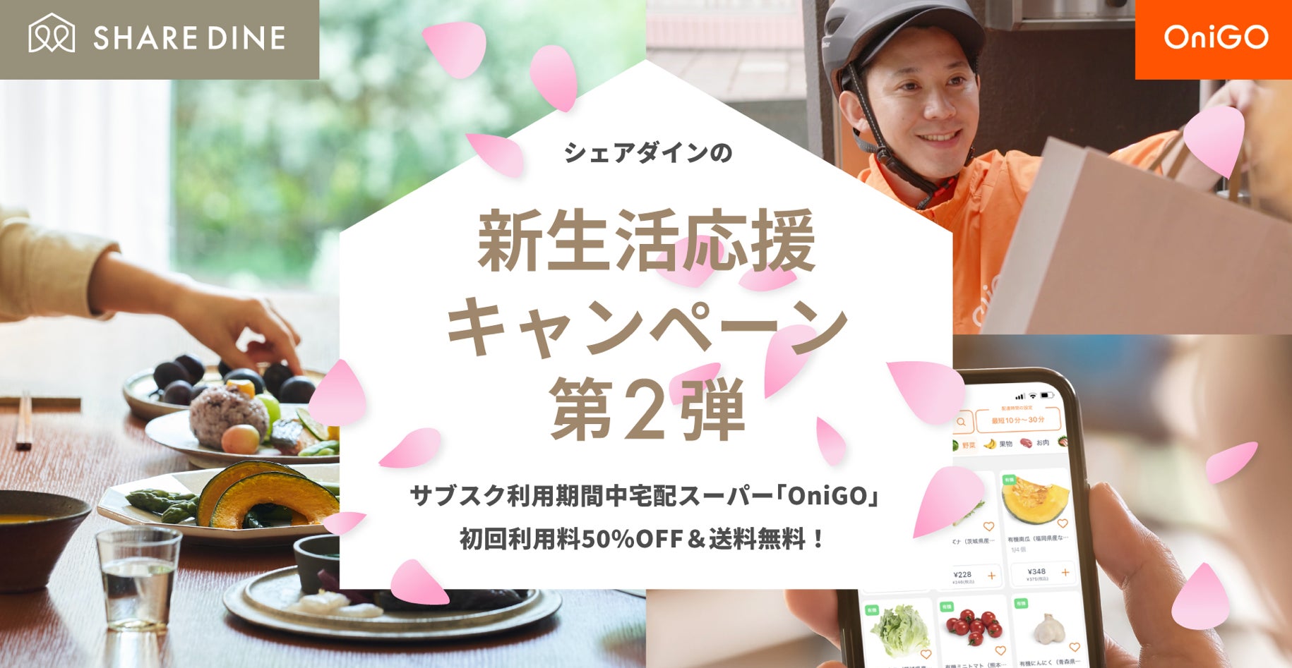 今回、コラボを実施するシェアダインでは「新生活応援キャンペーン第二弾」を開始し、食卓を共創するパートナーとして、4月からの職場復帰やお子様の小学校入学など新しい環境での両立に向けて準備する世帯を食卓から応援します。期間中に新規でシェアダインの定期サブスクにお申し込みいただいた方に「琺瑯容器3点セット」(5,500円相当)をプレゼントされ、OniGOからは、定額サブスクご利用中に限り、初回OniGO利用料50%OFF(利用上限1,500円)& 送料無料 の特典が付きます。