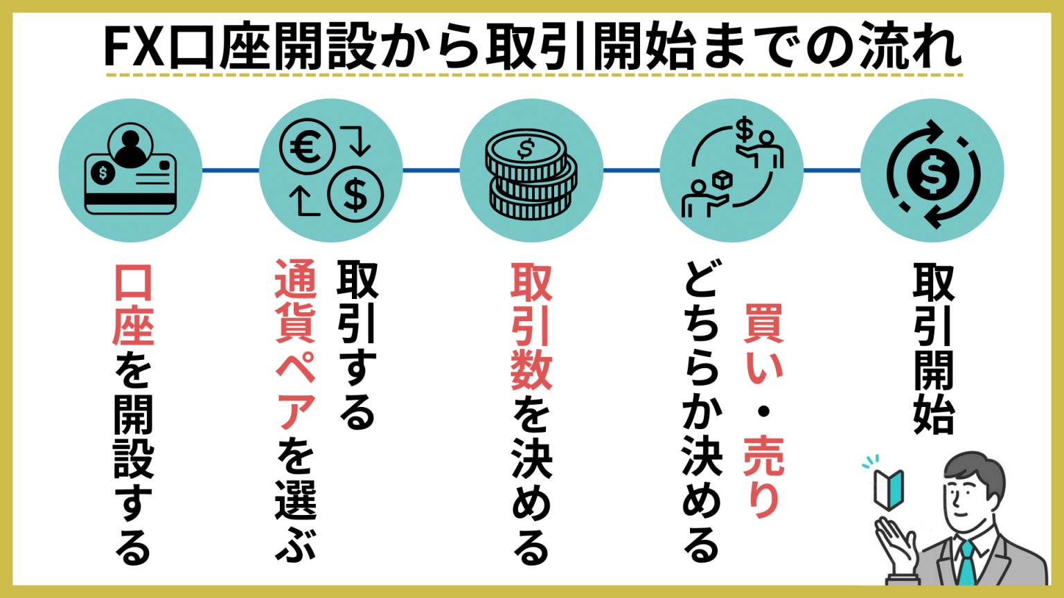 FXの口座開設から取引までの流れを5つのステップで把握できるため、スムーズな口座開設やFXの取引が可能です。各詳細な流れは掲載メディアにて紹介しています。