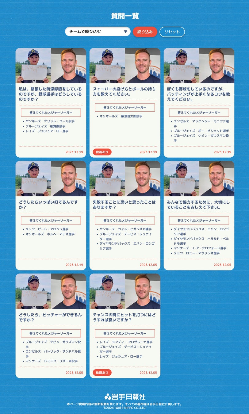 米ニューヨーク市在住の及川彩子特任記者が大リーガーに取材し、岩手日報ホームページ(HP)内の特設サイトや、岩手日報紙面の「ジュニアウイークリー」のコーナーに随時掲載します。2023年シーズンは質問募集を岩手県内に限っていましたが、計74人の子どもたちの質問に大リーガーが回答してくれました。