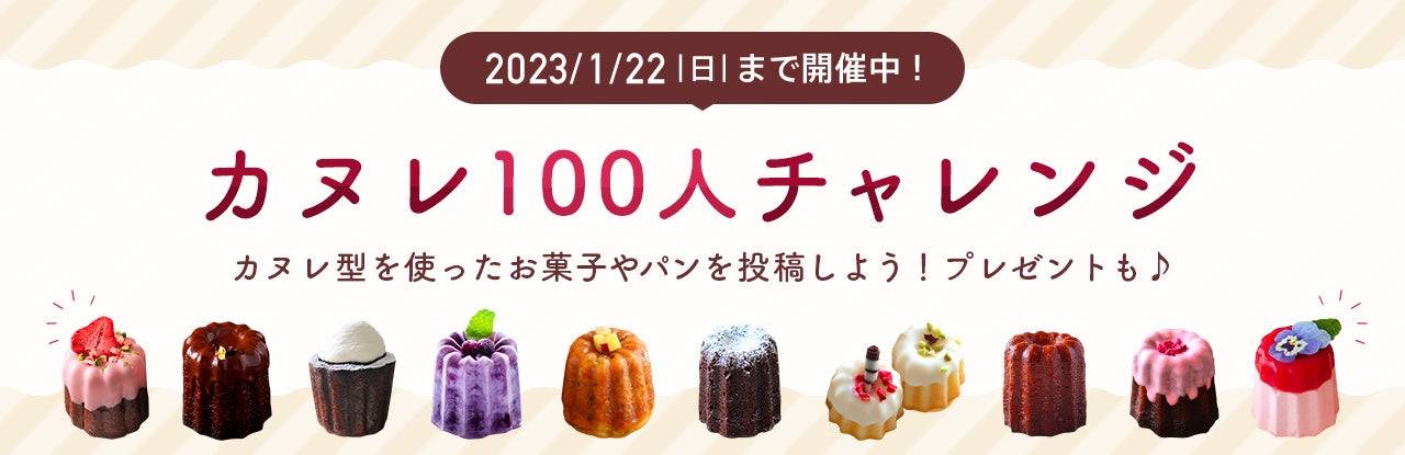 このたび、カヌレをもっと身近に感じ、お客様にお菓子作りを楽しんでいただきたいという思いを込めて、SNSキャンペーン「カヌレ100人チャレンジ」を実施いたします。特設サイトでは、カヌレ型の選び方からおすすめレシピ、アレンジやラッピングアイテムの紹介など、初心者でも簡単にカヌレ作りが楽しめるコンテンツを公開していますので、ぜひご覧ください。