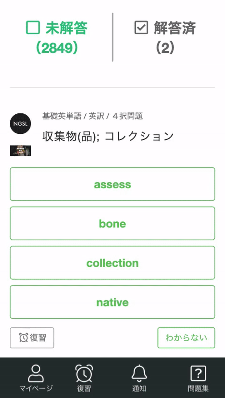 復習すべき問題が、タイムライン形式で表示されるので、簡単に復習することができます。