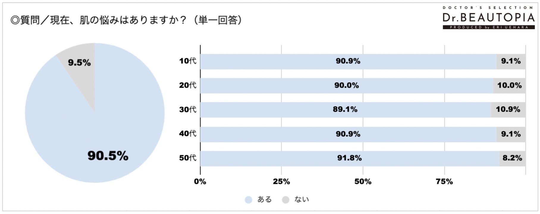 - ①【肌の悩みはある?】9割が「ある」と回答、多くの年代で肌悩みがあることが判明