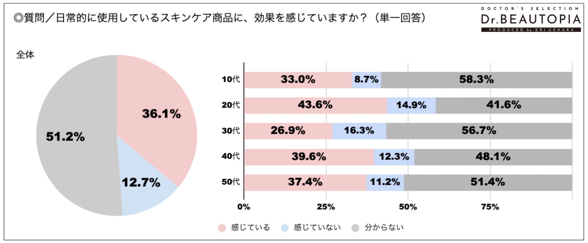 【10〜50代女性550名、最新スキンケア事情調査】《スキンケア商品の効果感じている?》半数以上が「そもそも効果が分からず使用している」ことが判明/購入時に重視すること、トップは「価格(63.5%)」