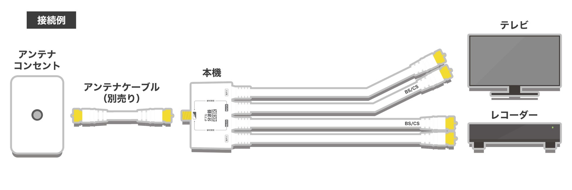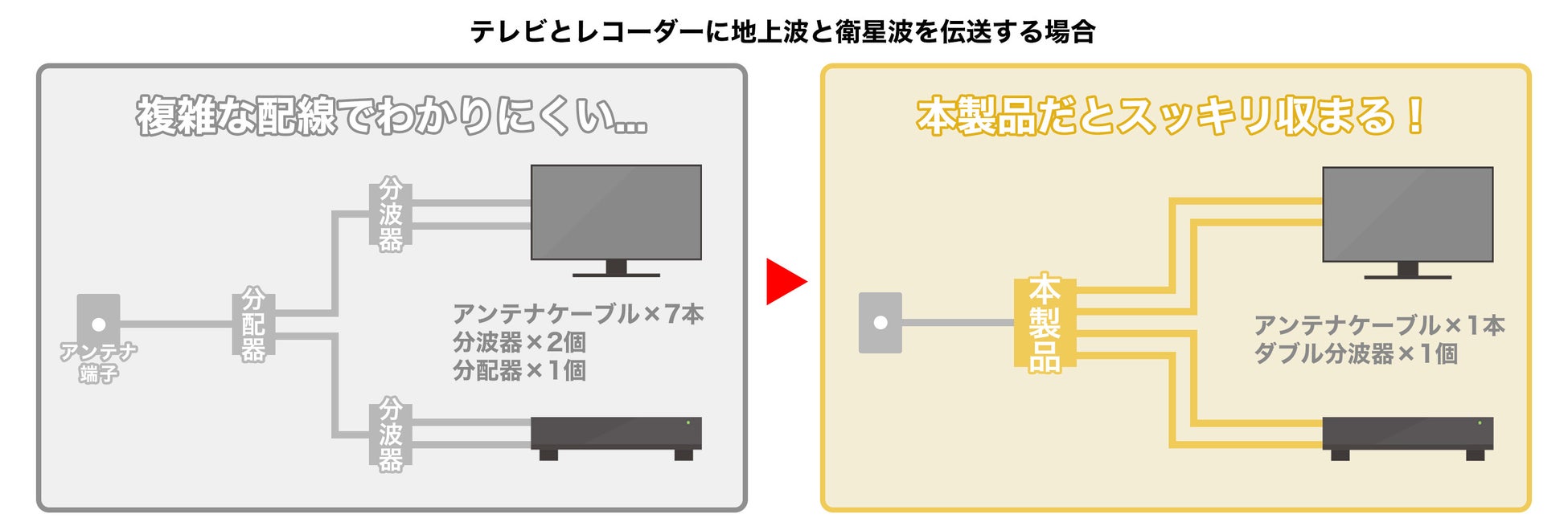 信号の分配と分波が本機一つで可能になり、テレビとレコーダーなどへの接続が無駄なくすっきりと行えます。