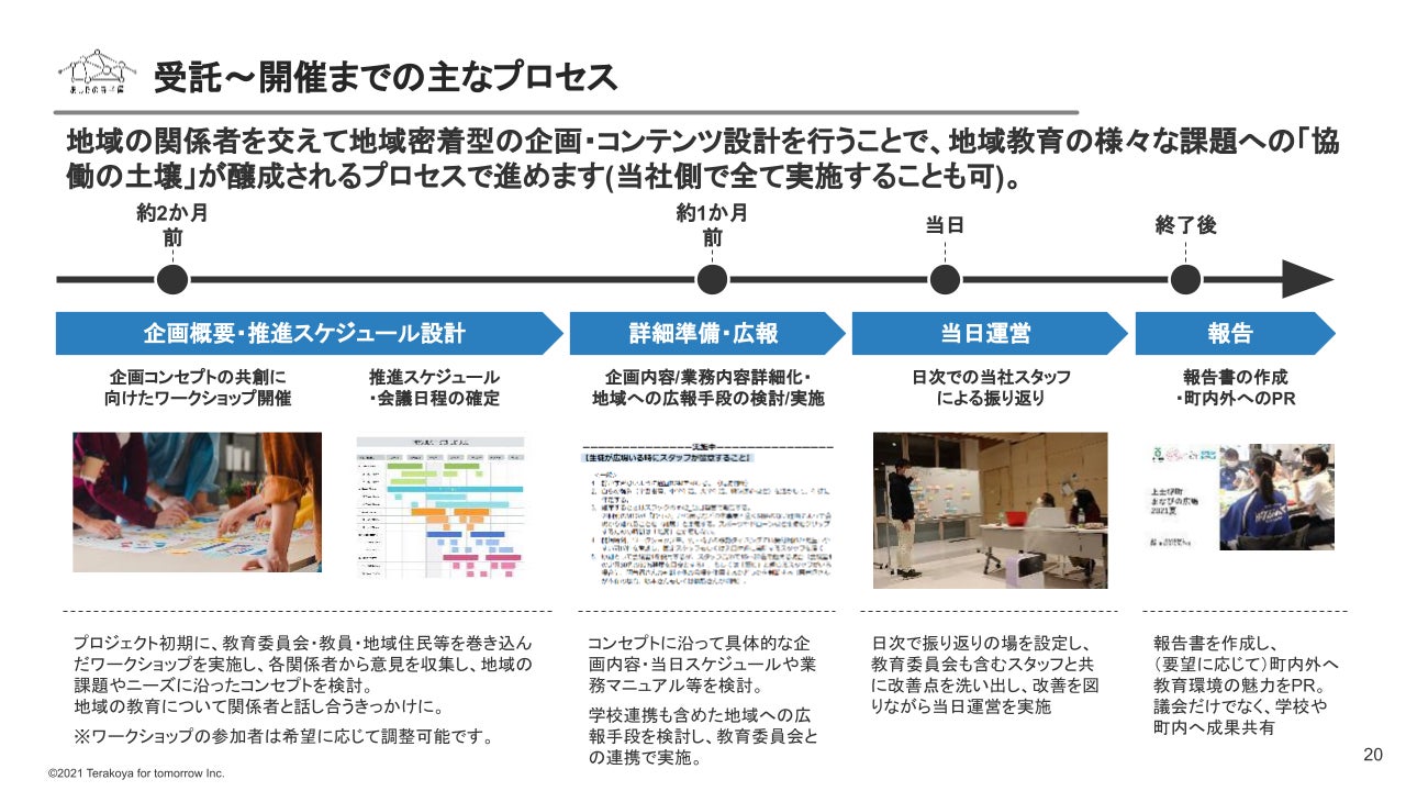 「あしてらCAMP」では、型にはまったプログラムを一斉提供することではなく、このプログラムの開催を望まれるパートナーの皆様との「協働の土壌」が醸成されるプロセスを重要視して事業を進めております。綿密な打ち合わせを重ね、コンセプトを共創しながら、オーダーメイド型でプログラムを開発し、事業報告を対外的にPRする部分までを並走させて頂きます。