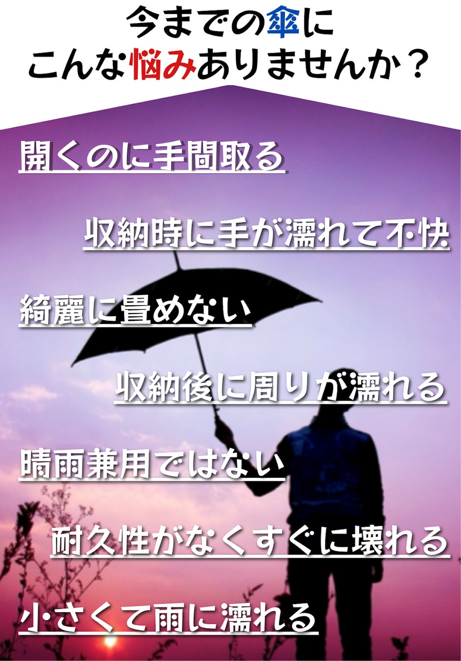 もう普通の折りたたみ傘には帰れない!傘の面倒を無くし欲しい機能を詰め込んだ365日使える究極の折りたたみ傘!