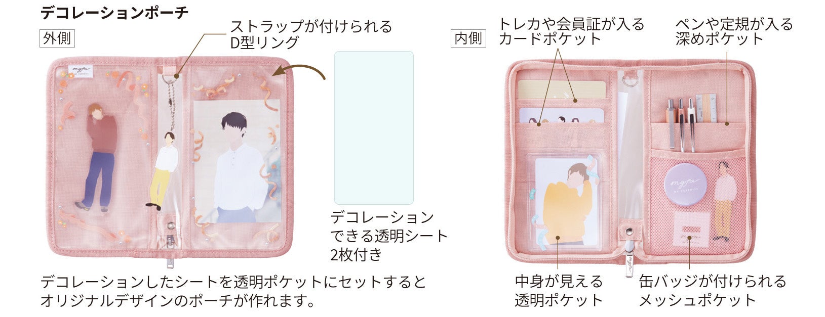 推し活グッズの持ち運びに便利な見開き式ポーチです。ミニサイズとスタンダードサイズの2サイズで展開いたします。外側の透明ポケットに付属の透明シートをデコレーションして挿入することで、自分だけのポーチを作ることができます。ミニサイズはカードポーチや文具小物の収納・パスポーチとして、スタンダードサイズはペンケースやトラベルポーチ・通帳ケースとしても活用いただけます。
