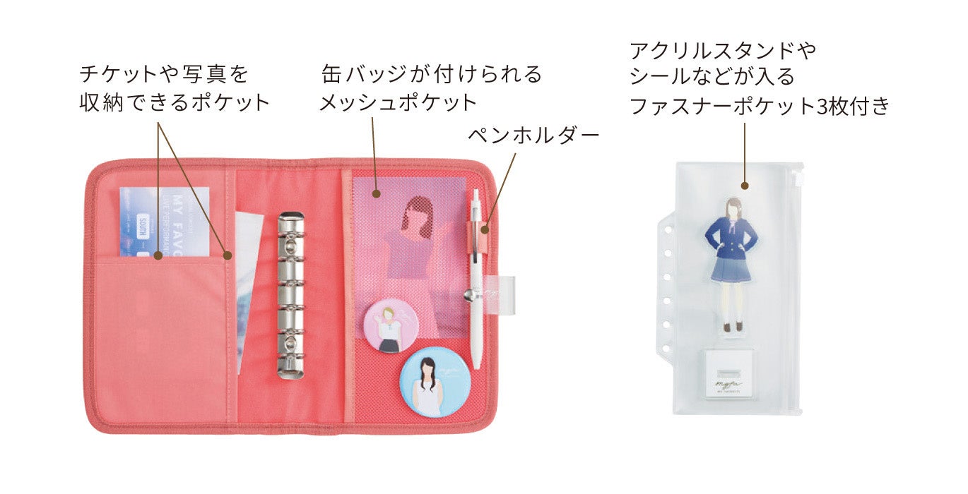 推し活グッズの持ち運びに便利なミニ6穴リング付きバインダーです。付属のファスナーポケットや本体ポケットに大きめのアクリルスタンドや缶バッチ、写真(L版)、チケットなどの推し活グッズを収納できます。別売りのリフィル(N-3321)で、ポケットを追加することができます。