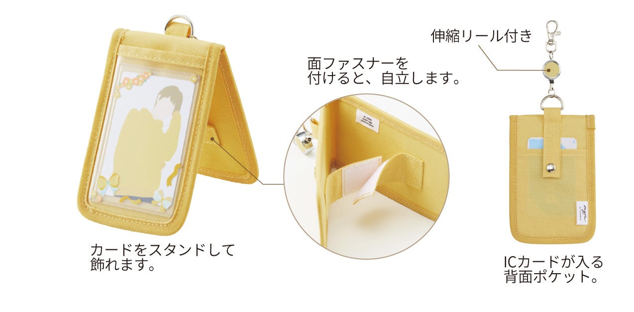 トレーディングカードやミニ写真を立てて飾れるケースです。本体内側の面ファスナーを使うと自立します。おもて面のPVCポケットは、トレーディングカードを硬質カードケース(B8サイズ)に入れたまま収納できるサイズ設計です。伸縮リールとボールチェーンが付属しているため、バッグに取り付けてカフェやコンサート会場にも持ち運びにもぴったりです。ICカードを収納できる背面ポケット付きで、パスケースとしても使用できます。
