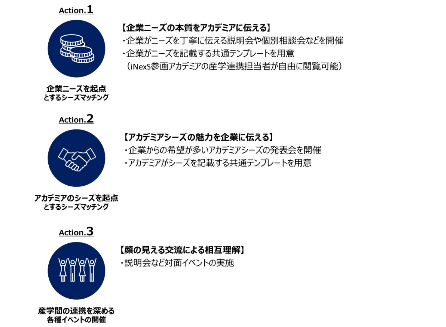 こうした課題の実態を深掘りするため、アイパークインスティチュートではこれまでに複数回、企業、アカデミアの双方にヒアリングやワークショップを実施しました。その結果から、本コンソーシアムでは、まず「企業のニーズとアカデミアがもつシーズのマッチング」に焦点をあて、企業と研究者が連携し、互いの強みを最大限に活かす環境を整えるために、以下の3つの軸で活動を実施します。