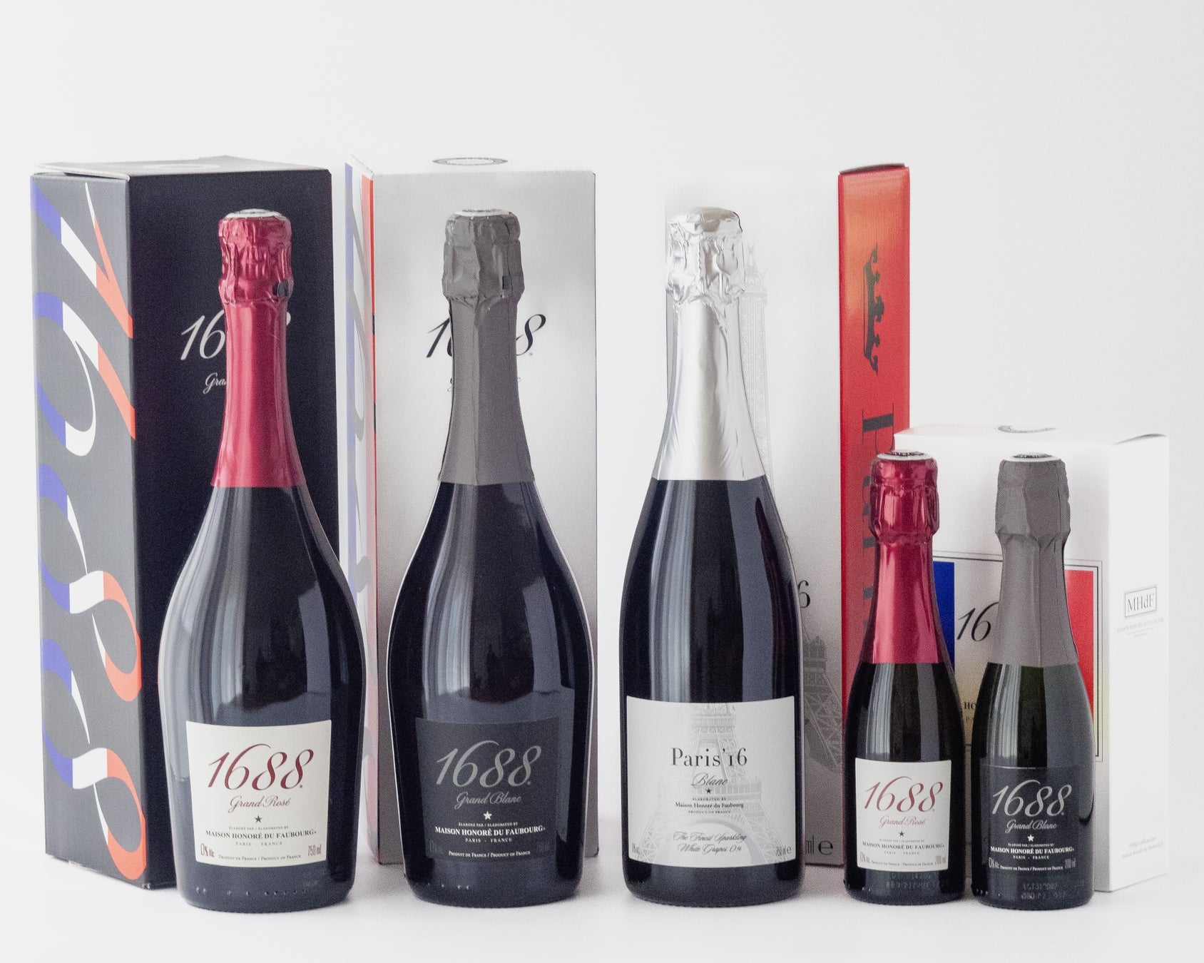 通常の1688とParis'16の750mlの化粧箱は、黒と白が基調。200mlのペアセットは4種類のレパートリーがあります。 その他、2024年新登場のトリコロールBox(写真下)はフランス国旗の青と赤が配色されています。