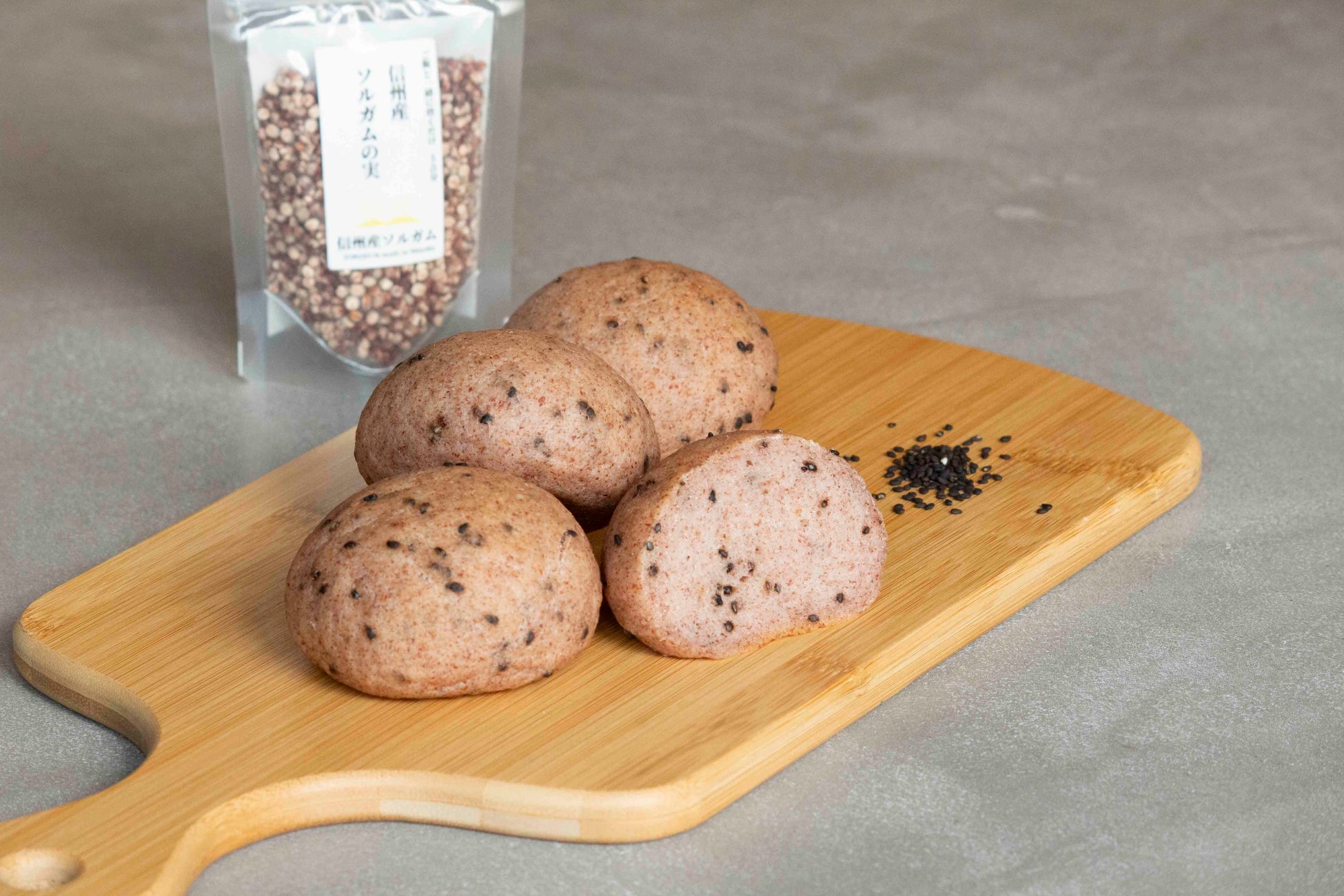 2019年から耕作放棄地対策とエネルギー化が期待される穀物、信州産ソルガムの普及促進に取り組んできました。信州産ソルカ?ムを使用したパンやお菓子はポリフェノールが含まれているソルカ?ムの赤い色が特徴。米粉とはまた一味違う食感と風味をお楽しみいただけます。