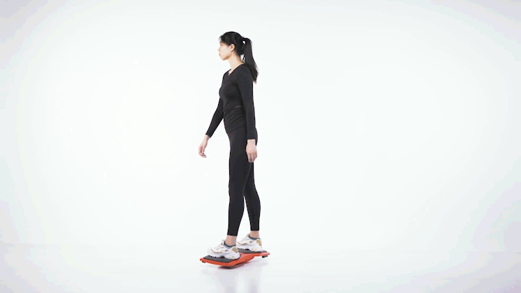 エクササイズボードの上に立つと、背中、脚、かかとが三点一列になり、動きながらバランスが取れた状態になり、体の重心も活動状態になります。
