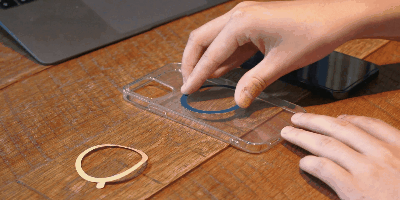 付属のマグネットシールをスマートフォン背面に貼り付ければ「MAGHO setup stand」にスマートフォンを簡単取付できる。