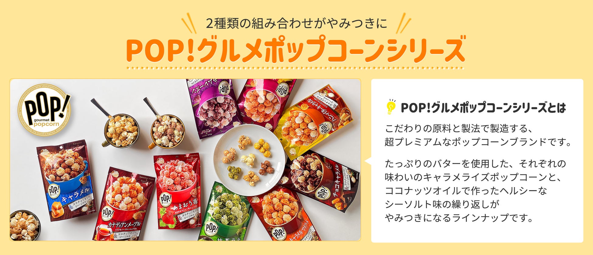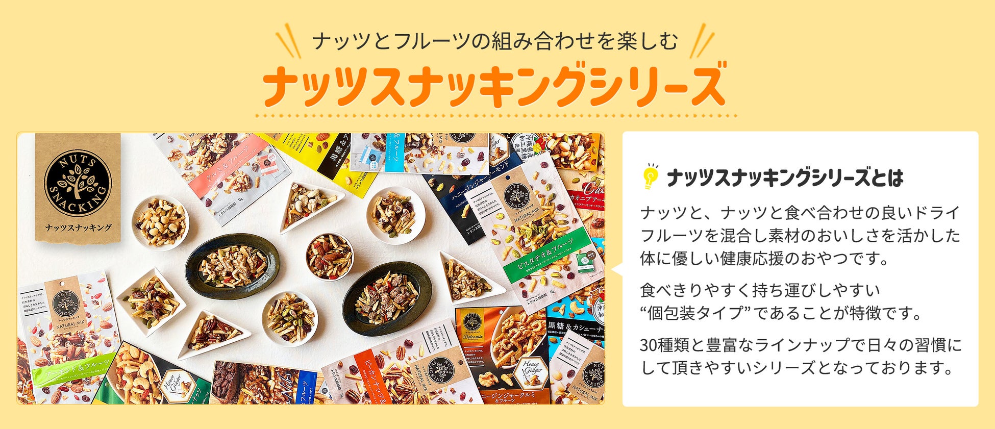 人気のナッツスナッキングシリーズ、POP!グルメポップコーンシリーズ、からだプラン ひとくちセサミンシリーズ、など、盛りだくさんのラインナップです。今後、通販サイト限定の商品も続々登場いたします。