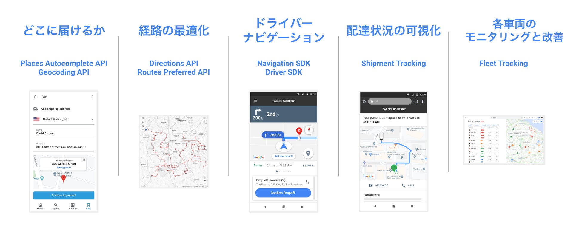 Google Maps Platform モビリティサービスは、配達用途に特化したさまざまなAPIやSDKを提供しています。