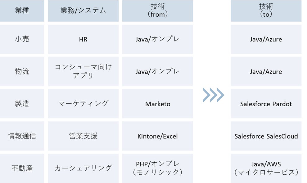 当社のモダナイゼーション事例のサンプルをご紹介します。以下のような業種、技術(from)のシステムをモダン環境へ移行してきました。