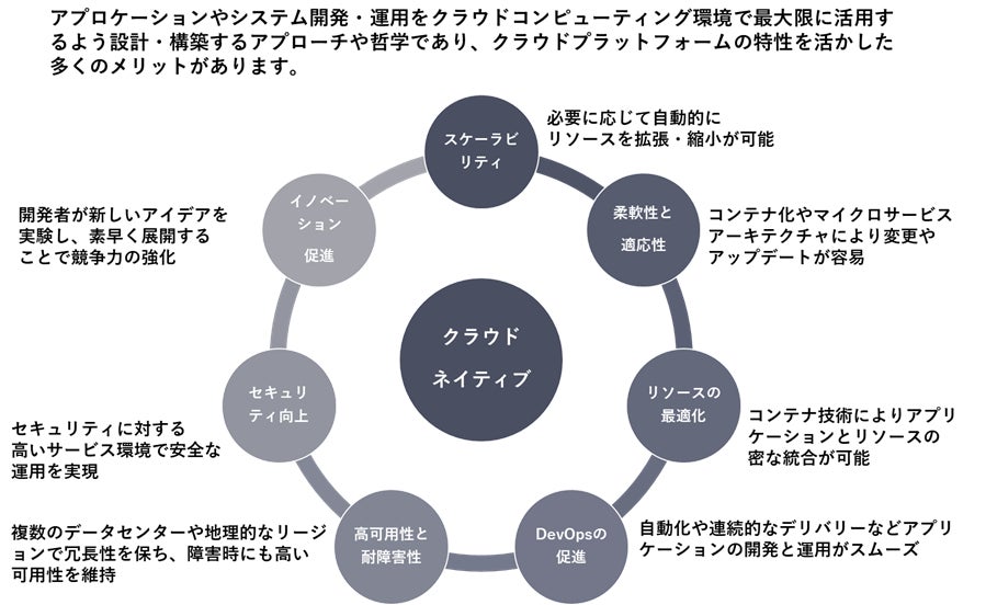 アプロケーションやシステム開発・運用をクラウドコンピューティング環境で最大限に活用するよう設計・構築するアプローチや哲学であり、クラウドプラットフォームの特性を活かした多くのメリットがあります。