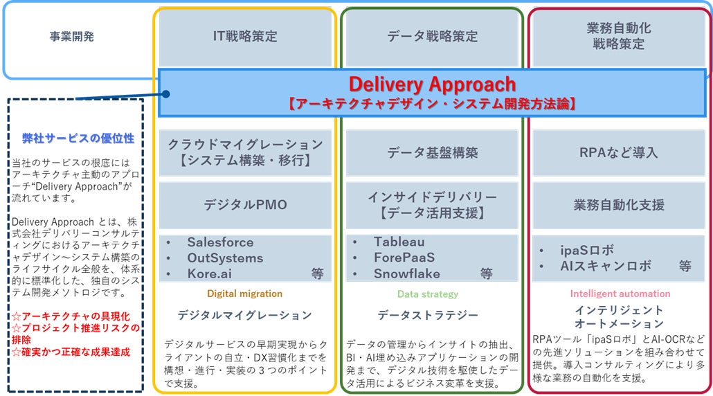 レガシーと最先端の双方を熟知したデリバリーコンサルティングのチームが、システム構築を体系的に標準化した独自のシステム開発メソトロジ「Delivery Approach」を使用して、各種サービスを提供しております。