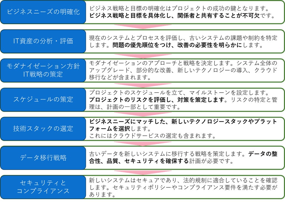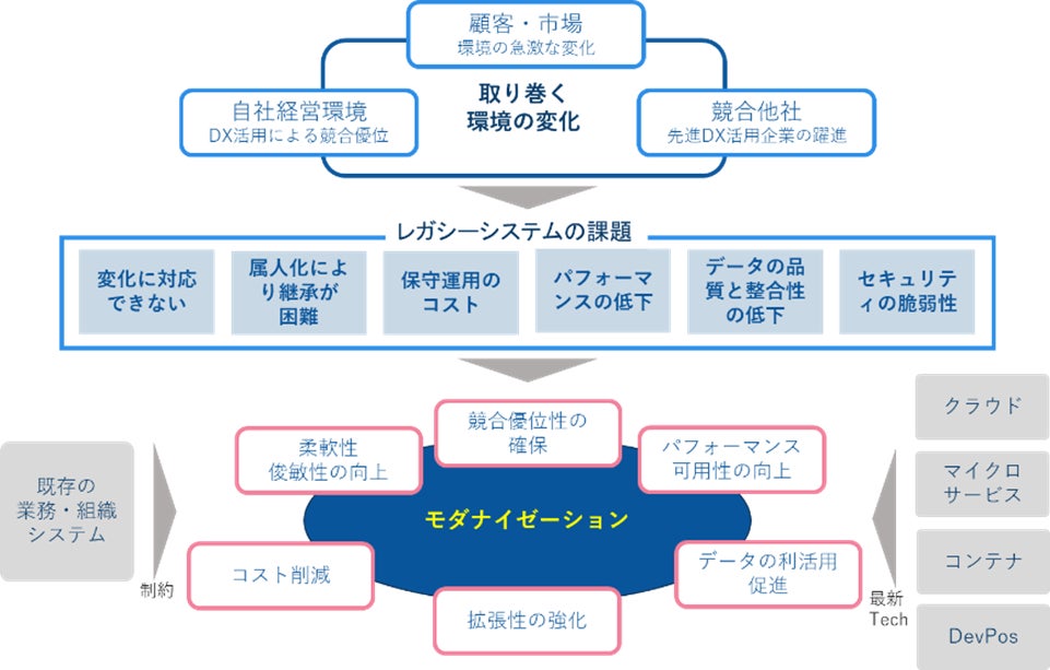顧客や市場を取り巻く環境の変化に対応するため、現代の最新テクノロジーを駆使することで、将来の変化に対応する拡張性と柔軟性、可用性を高め、システムの属人化を排し、運用コストを削減するモダナイゼーションを活用することが重要です。