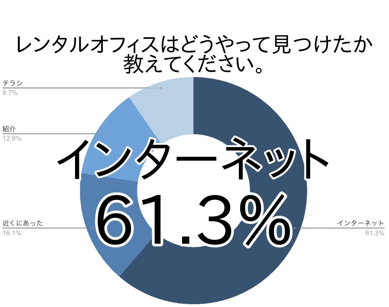 アンケートで最も多かったのはレンタルオフィスをインターネットで見つけたと答えた方で、約6割(61.3%)でした。